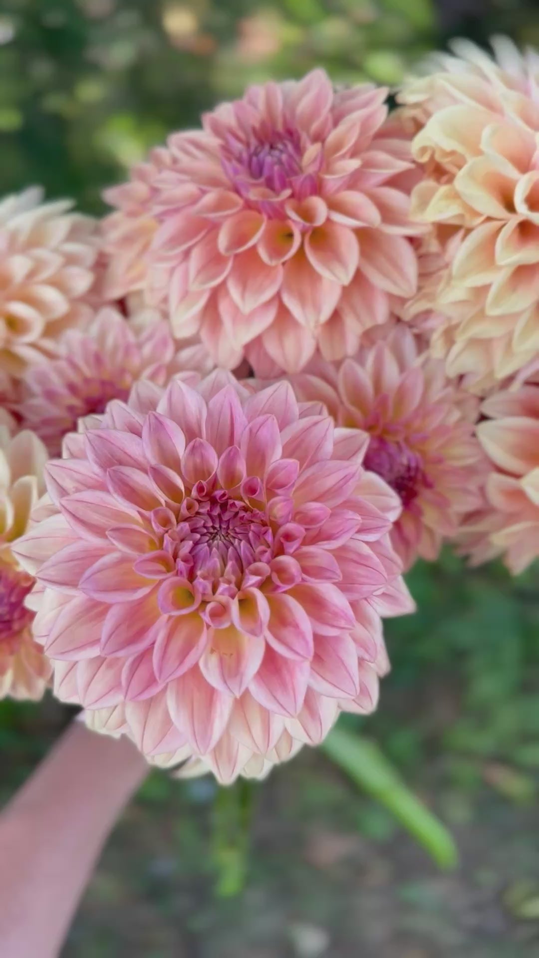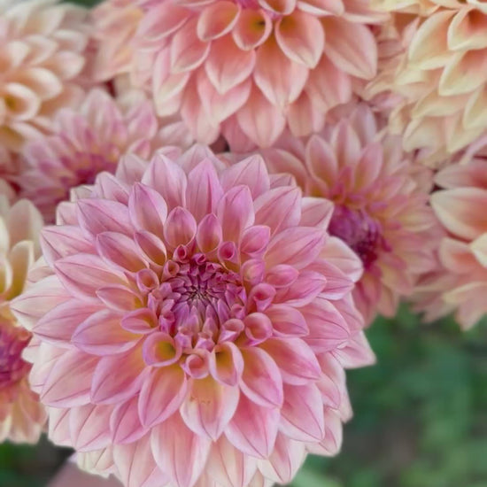 A very productive plant with a warm creamy pink-peach petals and a darker center flower. Large strong plant, large blooms, and great tuber producer!
