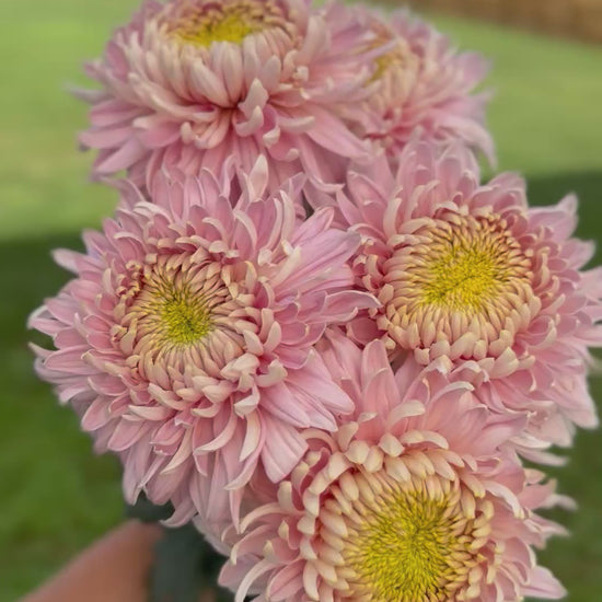 1 Heirloom Chrysanthemum rooted cutting that produces a beautiful large soft pink petal flower with a lime green centre. This variety can be disbudded for larger flowers.