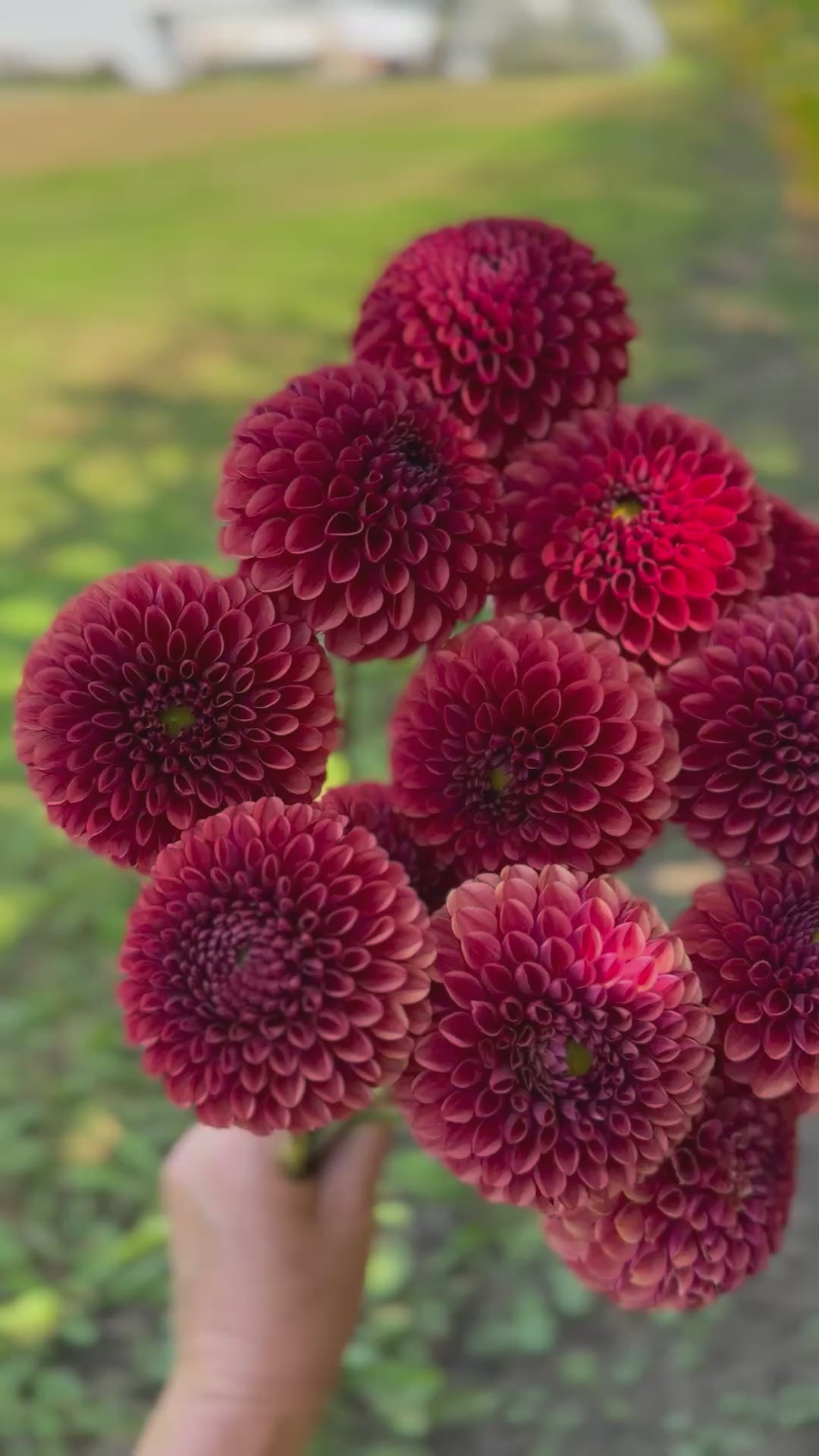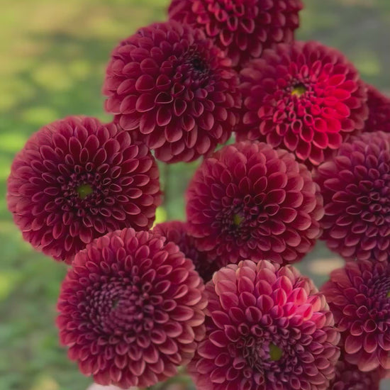 The perfect dusty, warm red blooms! A truly unique muted red colour ball dahlia.