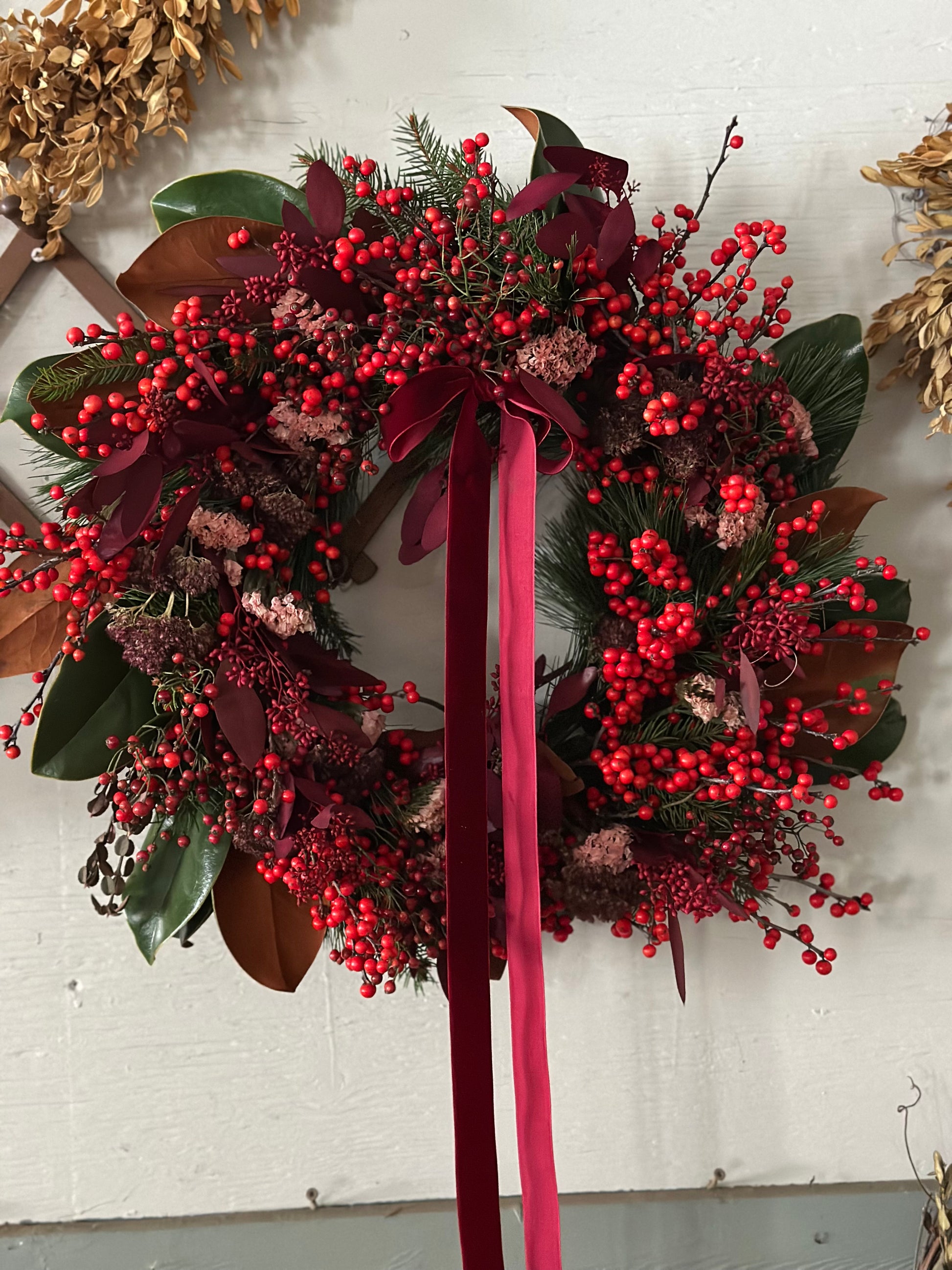 Pre-made, ready for pick-up red rose hip, winterberry, red seeded eucalyptus winter wreath.
