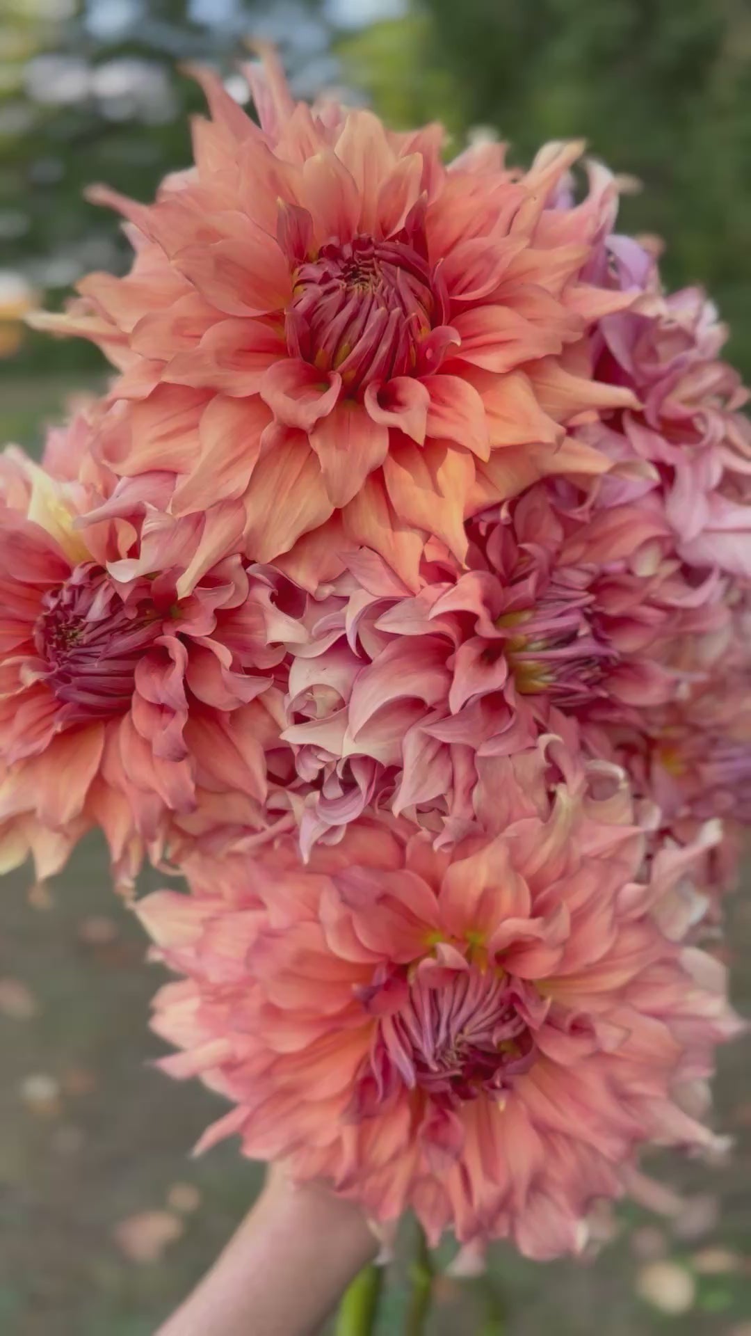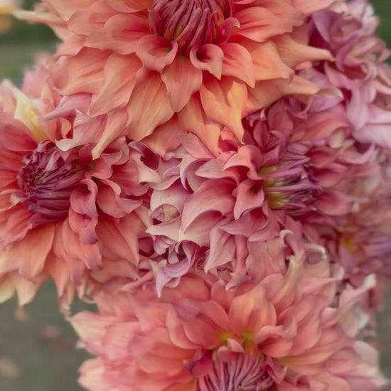A stunning soft salmon-peach-bronze dinner plate dahlia that produces lots of beautiful tubers.