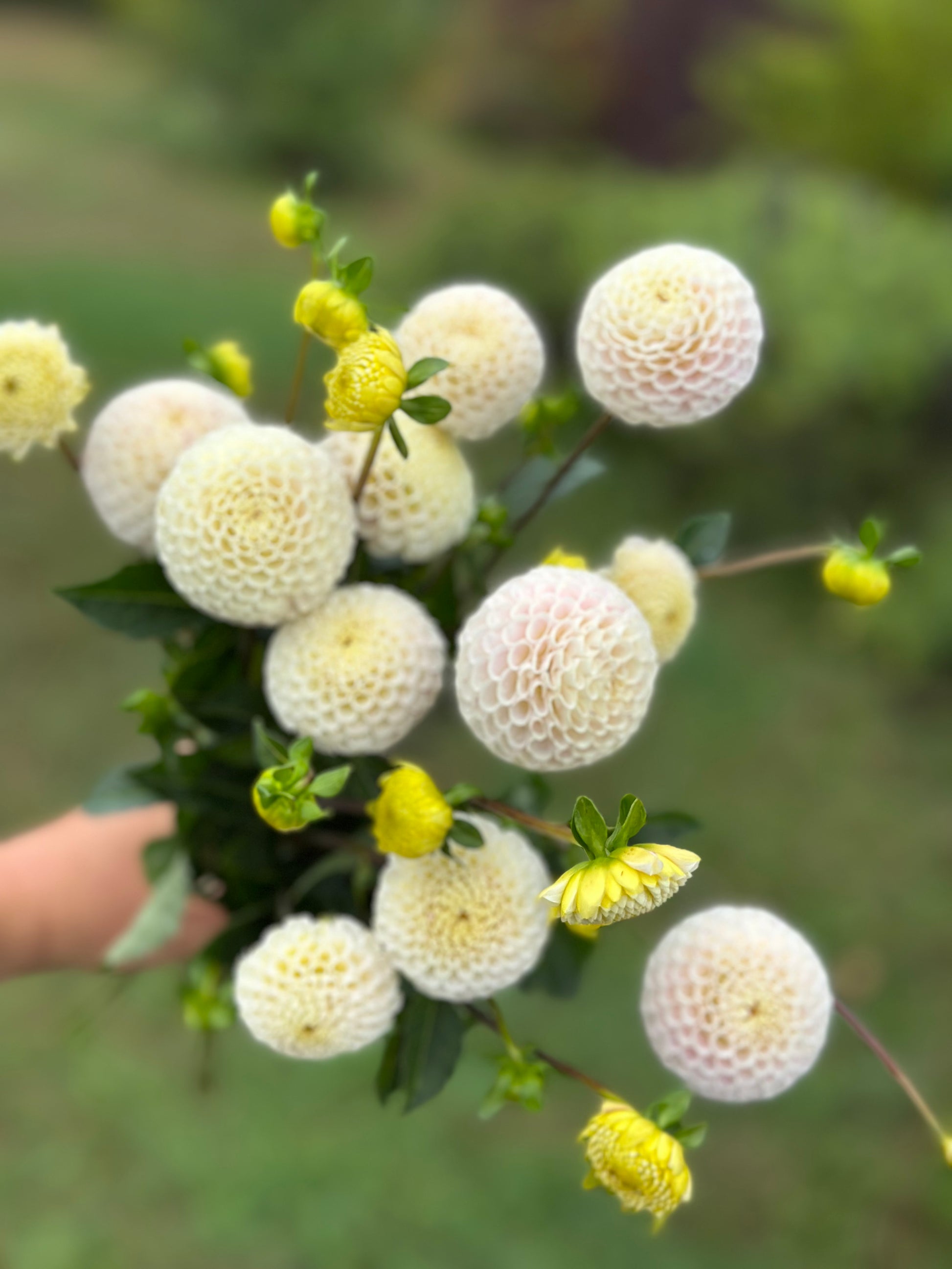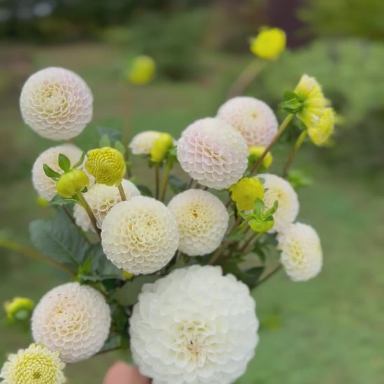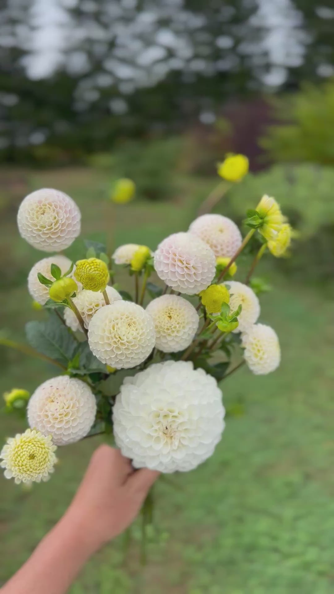 The cutest white miniature ball dahlia! Very prolific and is perfect to add a whimsical texture to any bouquet.